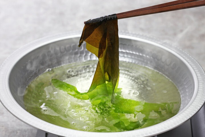旬の「生」だからこそ味わえる究極の食べ方が**「しゃぶしゃぶ」です。 茶色い生のわかめやメカブを熱湯にくぐらせた瞬間、鮮やかな「エメラルドグリーン」**にパッと色が変わります。この変化は食卓で歓声が上がるほどの美しさです。